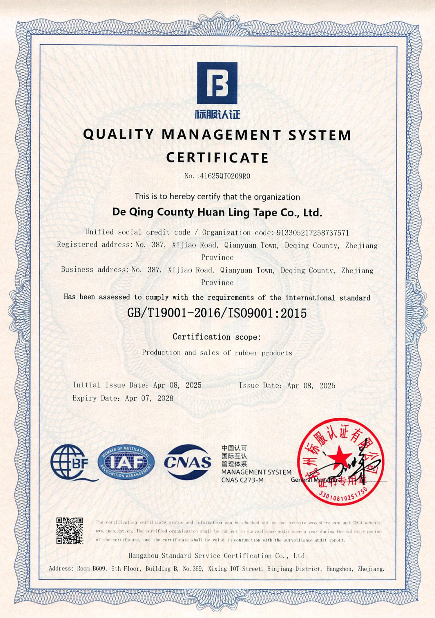 Quality Management System certification ensuring consistent product quality and customer satisfaction across all manufacturing processes.